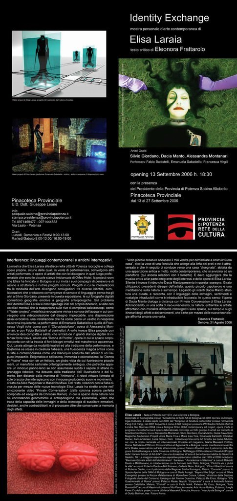 La mostra che Elisa Laraia allestisce nella città di Potenza raccoglie e collega opere proprie, alcune delle quali, in veste di performances, coinvolgono altri artisti-performers, e opere di artisti che con lei dialogano in quel luogo preferenziale che sono le piccole stanze imbiancate di Orfeo Hotel, la project room che Elisa ha fondato in Bologna in cui invita i suoi compagni di pensiero e di azione a strutturare e nutrire progetti comuni. Progetti in cui le interrelazioni tra le modalità dell’arte divengono coniugazioni tra diverse identità, cum-laborazioni che producono convergenze di senso e di linguaggi e penso tra gli altri a Silvio Giordano, presente in questa esposizione, le cui fotografie digitali connettono geografie emotive a geografie antropologiche. Sul problema dell’identità Elisa Laraia si interroga dagli inizi del proprio itinerario, a volte con corollari mentali che la trasportano sulle rive di complessi caleidoscopi, come il “Water project”, metafisica evocazione visiva e sonora dell’acqua in cui convergono una videoproiezione dal disegno impeccabile, una diaproiezione assai evocativa, una installazione che ha come perno un vestito in neoprene da sirena inquietante, la performance di Emanuela Sabatiello e quella di Francesca Virgili (che opera con il “Cloroplastofono”, opera di Alessandra Montanari, e con Fabio Battistelli al clarinetto). A volte invece Elisa procede con un‘unica idea compatta e salda, che si traduce in grandi stampe digitali di intensa forza visiva, alludo alla “Donna di Picche”, opera in cui lo spazio corporeo porta con sé la traccia di forti bisogni emotivi resi maschera e apparenza. Qui, Laraia attinge da modalità teatrali ed alla tradizione della performance, e trasforma se stessa in creatura fiabesca, una fluescenza magica antica come le fate e contemporanea come una manequin scaturita dall’ atelier di un Capucci impazzito. Enigmatica e bellissima, immensa e coloratissima, la “Donna di Picche” reca con sé un feticcio, un globo viola da cui fuoriescono piccole mani, un manufatto sartoriale ontologicamente ambiguo, che potrebbe apparire un innocuo panno-lenci se non assumesse subito il sapore di strano ingranaggio robotico, ma desunto dalla tradizione dell’ illustrazione e del fumetto, ben distante dalla maniera di “Animatrix”, il robot virtuale formato di sole braccia che interagiscono con il mouse producendo suoni e movimenti, creato da Akke Wagenaar e Masahiro Miwa. Del resto, relazioni con la fiaba rivissuta per mezzo delle nuove tecnologie Elisa Laraia ha stretto anche nell’ emozionante video “Private Conversation” (dalla colonna sonora perfetta composta ed eseguita da Christian Rainer) in cui la spazio della natura non ha connotazioni geometriche o antropologiche ma esistenziali, video che tratta della capacità delle immagini e della tecnologia di suscitare emozioni, desideri, anche contraddittorii, e di provocare oltre che conservare la memoria degli affetti.