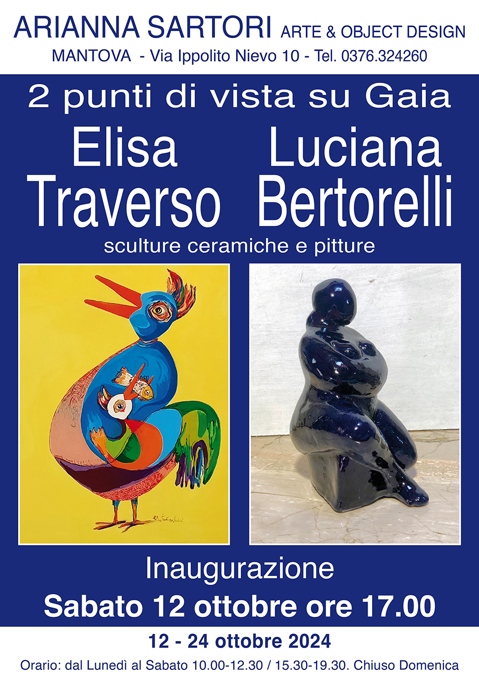 L’interessante mostra “2 punti di vista su Gaia”, sculture ceramiche e pitture di Elisa Traverso e Luciana Bertorelli, si inaugurerà Sabato 12 ottobre alle ore 17.00 alla Galleria Arianna Sartori di Mantova in via Ippolito Nievo, 10.
