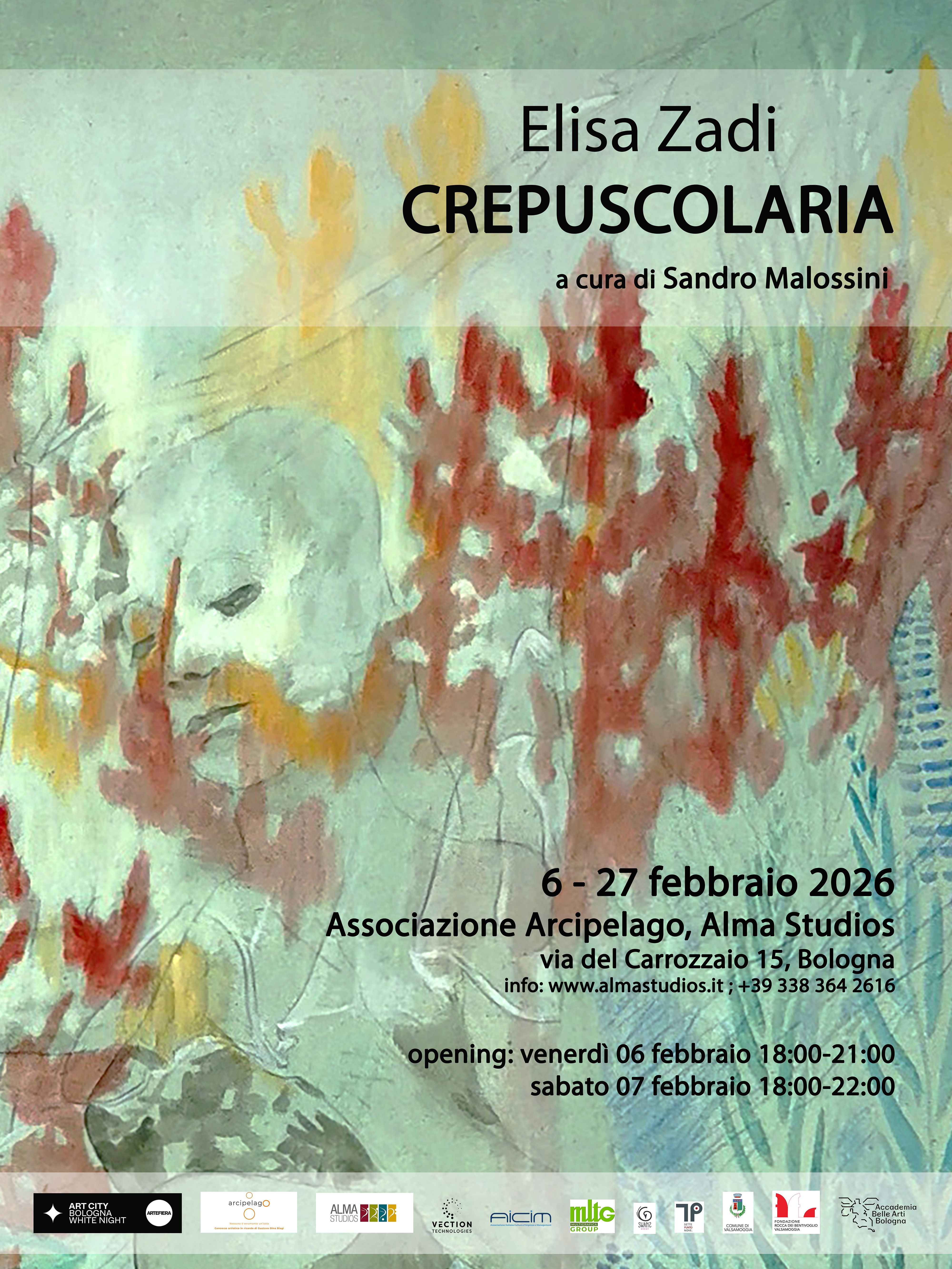 In occasione di Art City e Art City Night, sotto la direzione di Lorenzo Balbi, in concomitanza con Arte Fiera e in collaborazione con la Fondazione Rocca dei Bentivoglio, l'Associazione Arcipelago inaugurerà i nuovi spazi dedicati alla Collezione Arcipelago e alle mostre temporanee, presso Alma Studios, con la mostra personale di Elisa Zadi, vincitrice del Contest Arcipelago 2024, dal titolo Crepuscolaria.