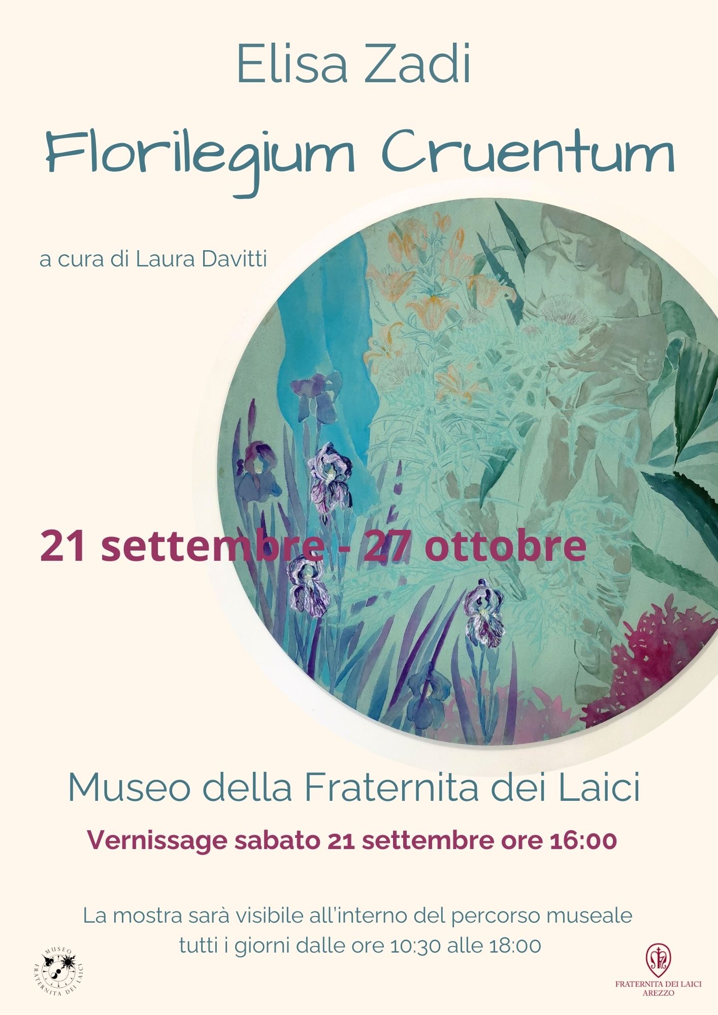 Sabato 21 settembre 2024 alle ore 16:00 inaugurerà la mostra personale di Elisa Zadi “Florilegium Cruentum”. La mostra a cura di Laura Davitti sarà ospitata nel piano nobile del Museo della Fraternita dei Laici ad Arezzo, edificio vasariano situato accanto all'omonimo loggiato e inserito nella splendida cornice scenografica di Piazza Grande.