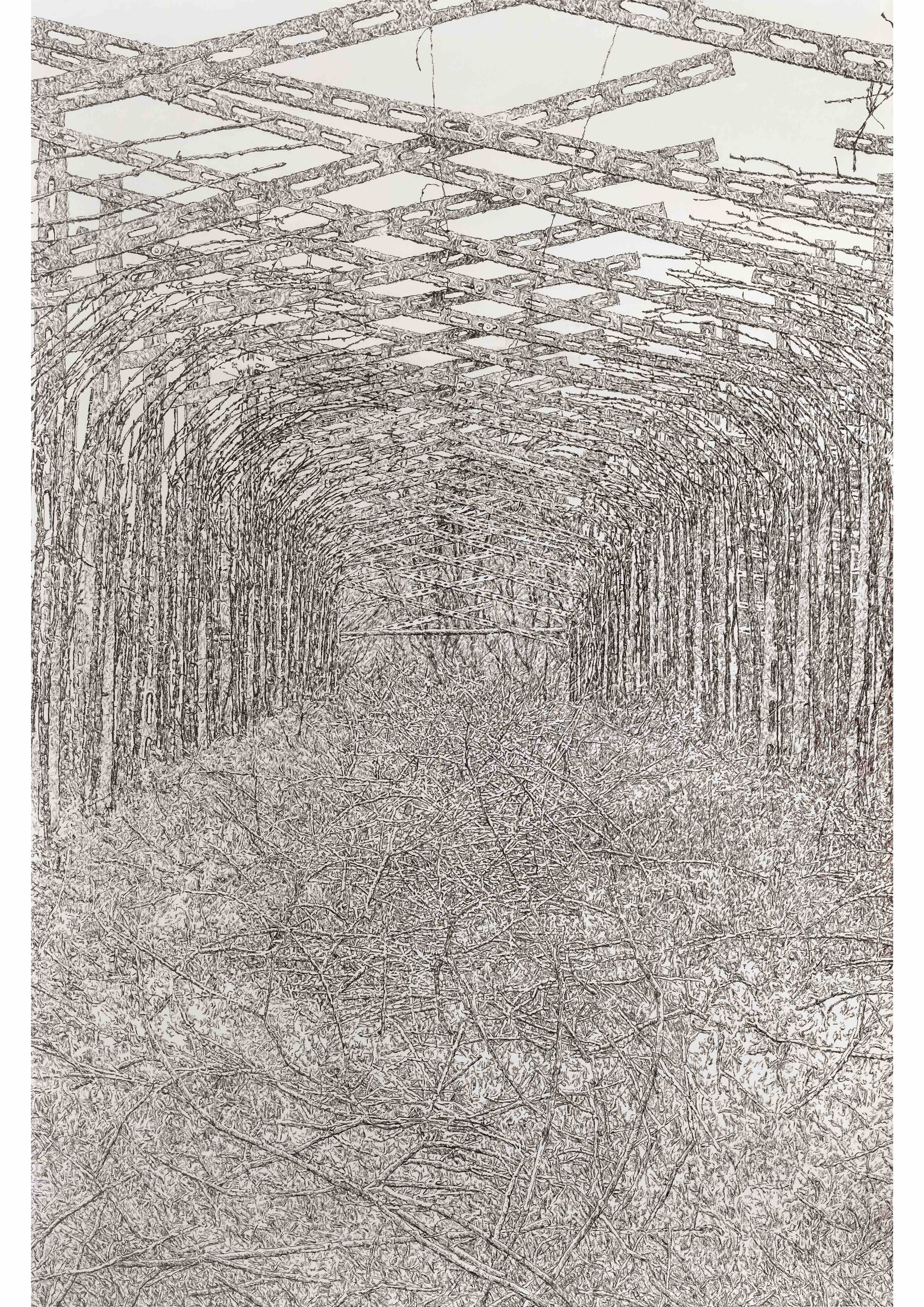 Un grande disegno, assai articolato, mostra una vigna che si fa architettura, un lavoro su metallo inciso e perforato diviene mappatura di una struttura labirintica. In altri disegni l’architettura, al di là della propria connotazione specifica, è osservata nel suo farsi.