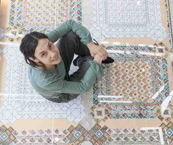 Nella storica galleria di Corso Monforte, Elisabetta Di Maggio presenta Greetings from Venice, l’immensa installazione site specific inizialmente pensata per il Fondaco dei Tedeschi di Venezia. Si tratta di un “immaginario” pavimento di mosaici, ispirato a quello della Basilica di San Marco di Venezia. Un pavimento che non tiene, che non resiste ma che, come tutte le sue opere, perturba, sconvolge, rende increduli mentre spalanca memorie.