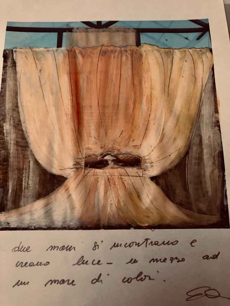 costituiscono le quinte per un’azione teatrale dove delle mani contengono la forza produttrice e luminosa della vita, che tutto produce che tutto crea e, che spinge verso l’ignoto.
