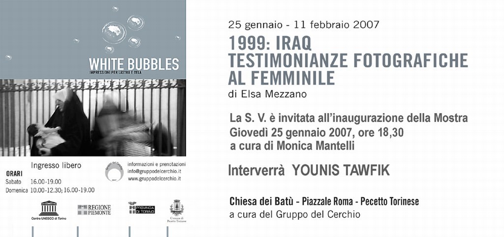 Giovedì 25 gennaio 2007 alle ore 18,30 il GRUPPO DEL CERCHIO inaugura la mostra fotografica “IRAQ 1999. TESTIMONIANZE FOTOGRAFICHE AL FEMMINILE di Elsa Mezzano e curata da Monica Nucera Mantelli presso la Chiesa dei Batù di Pecetto T.se. La mostra rappresenta l’ultima tappa della 1ma rassegna multidisciplinare “White Bubbles” ideata e prodotta dal Gruppo del Cerchio nel 2006. “IRAQ 1999. TESTIMONIANZE FOTOGRAFICHE AL FEMMINILE” consta di 17 immagini a colori in formato 70x100 e 60x80 inerenti la vita irachena visti dall’occhio di una donna reporter. Partecipa all’apertura della mostra lo scrittore iracheno Younis Tawfik.