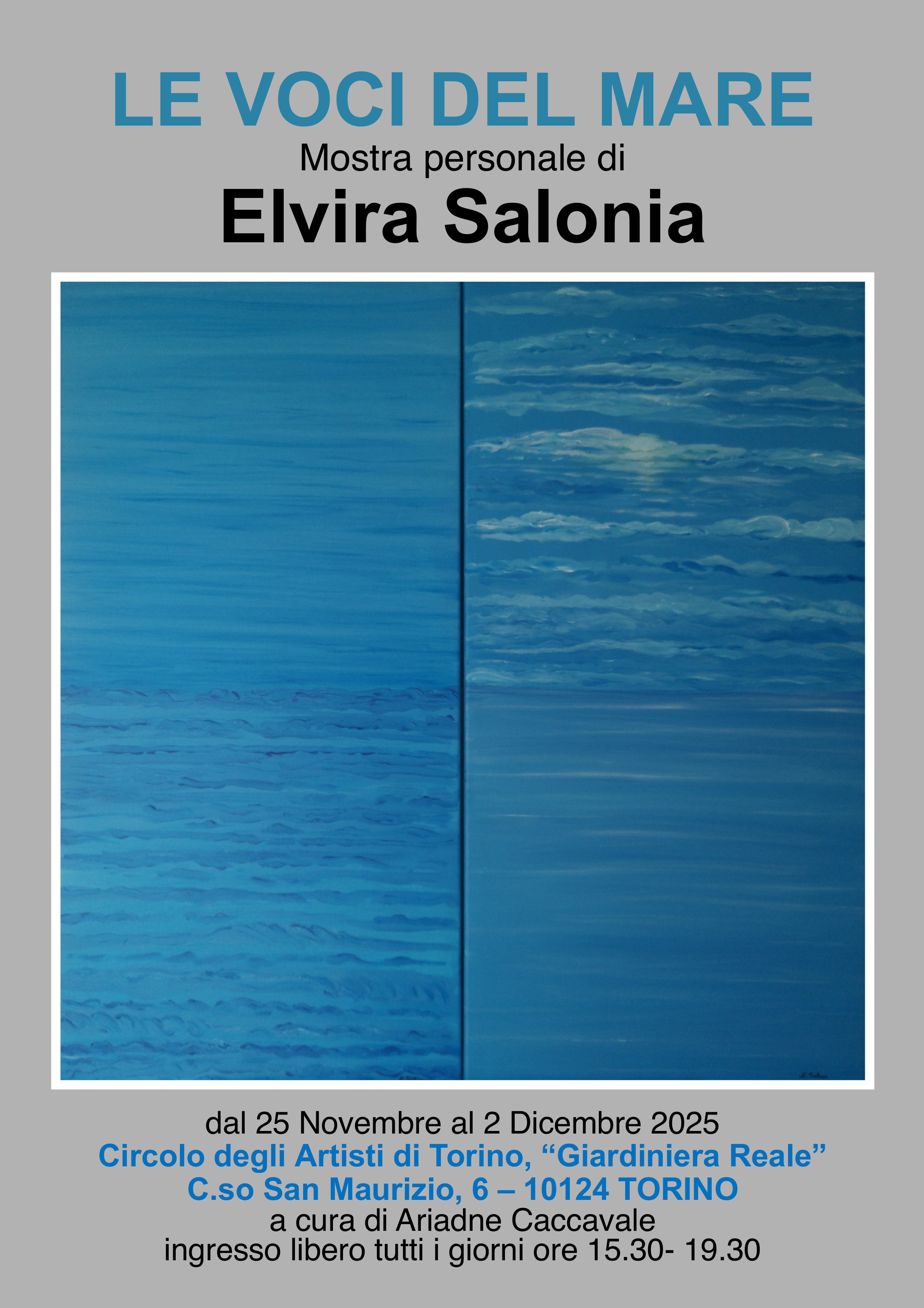 dal 25 Novembre fino al 2 Dicembre, negli spazi della Giardiniera Reale di Torino, la mostra “Le voci del mare” dell’artista Elvira Salonia. Una riflessione sulla salvaguardia dell’ambiente, contro l’inquinamento delle acque.