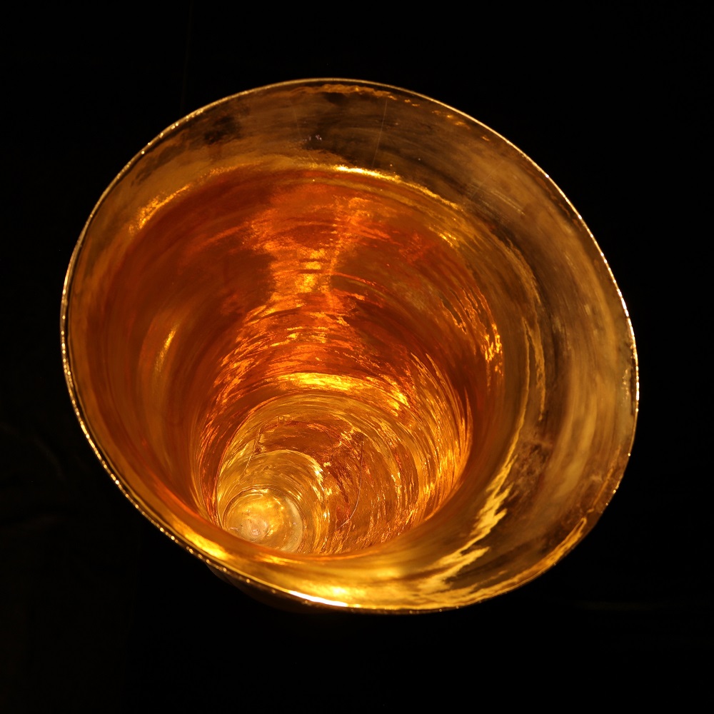 presenta una installazione di grandi vasi in terre refrattarie o porcellana lustrati all’interno con oro puro o smalti, trionfo della trasmutazione materica e della bellezza scaturita dai sortilegi della chimica, di Elysia Athanatos.