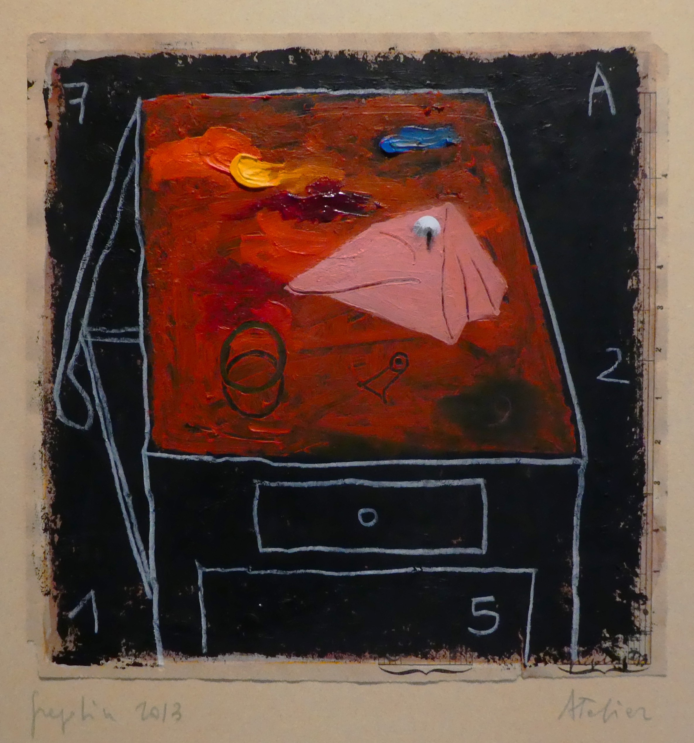 Come scrive la curatrice, ecco un continuo ritorno di elementi che si fanno simbolici: “il tavolo da lavoro; lo sgabello del pittore; la tavolozza che assume le sembianze di un pianoforte a coda, perché la musica è un'altra grande passione dell'autore; la luce, una piccola e semplice lampadina che scende dall'alto _ ricordo dell'uovo di Piero della Francesca e fulcro della composizione; l'umile letto per il riposo. Il pavimento scuro, nudo e scarno, porta le tracce dell'attività e della vita, come un graffito dell'esistenza, su cui aleggiano gli oggetti dimenticati che raccontano le loro storie: l'iPhone per le relazioni e le amicizie; l'indumento intimo per la sessualità; i numeri della data di nascita dell'artista; le lettere significative, la “a” di atelier e la “e” iniziale del suo nome.” Inizialmente l'atelier si apra alle figure umane, appena accennate, e alla città con le finestre e le porte che danno sull'esterno. Successivamente, le opere si concentrano sull’universo chiuso e le immagini diventano maggiormente astratte e pulite. Si asciugano e si solidificano in un processo sempre più rigoroso che vede le tele diventare forme simboliche pure.