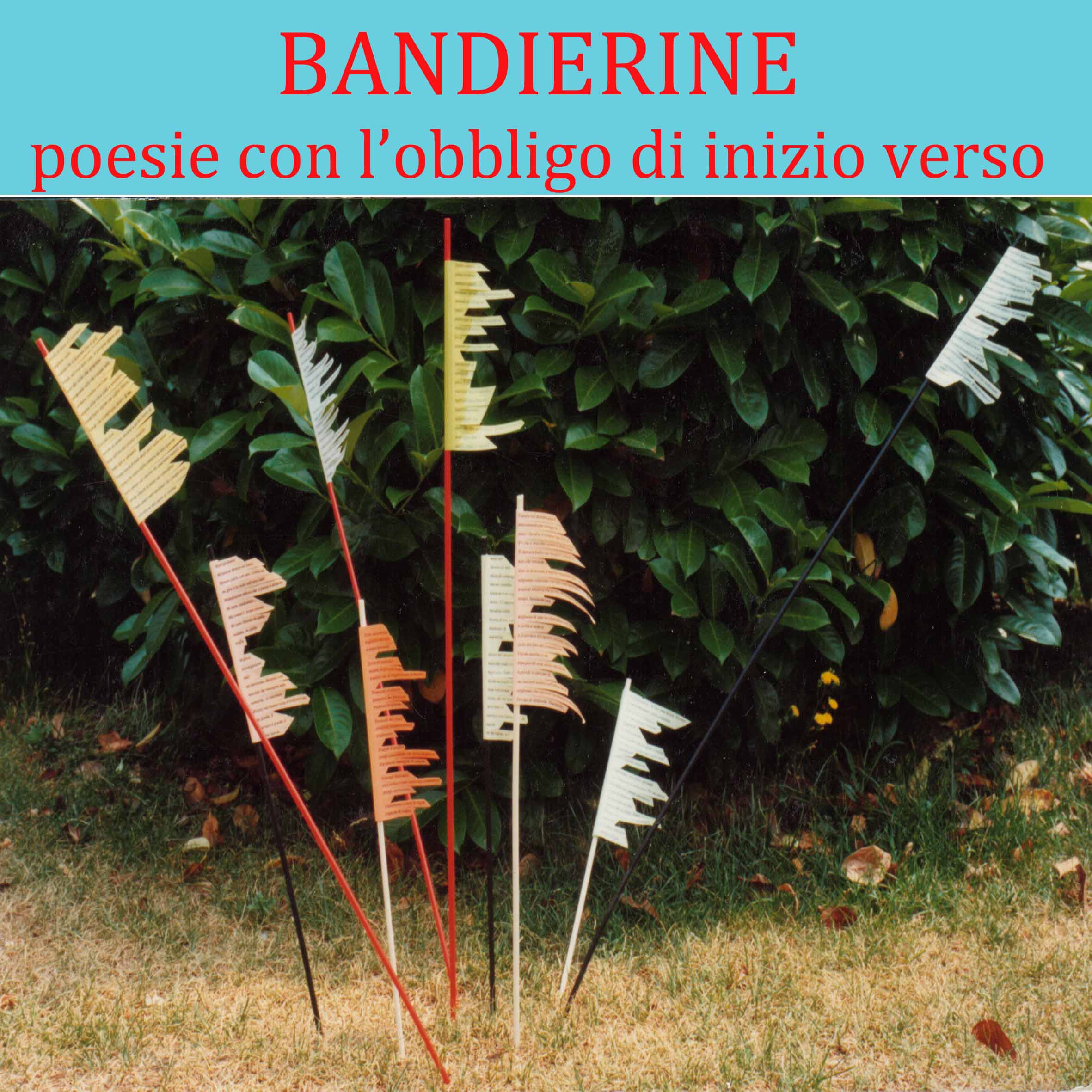 Ecco allora in esposizione il volume con le installazioni a bandierina che compongono messaggi poetici. Ogni poesia è costituita di venti versi che iniziano con la medesima lettera. Le bandierine sono realizzate con tubicini di plexiglass mentre il testo è su fogli trasparenti. Altre bandierine co-lorate, invece, formano una sorta di bouquet floreale. Le 100 Bandierine del 1990 erano state pre-sentate alla Libreria Buchmesse di Michelangelo Coviello al Festival dei piccoli editori, collaboran-do con la sezione genovese del gruppo 93 (Slittamenti).