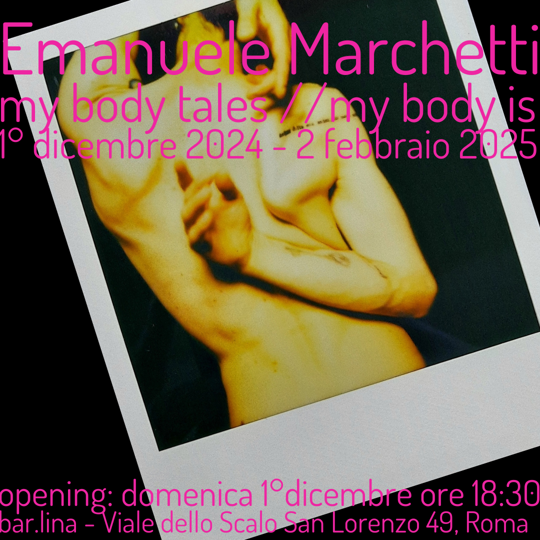 A partire da domenica 1° dicembre bar.lina ospita la prima mostra personale dell’artista Emanuele Marchetti “MY BODY TALES // MY BODY IS” a cura di Andrea Acocella e promossa all’interno di DRAG ME UP – Art For Inclusion “IMMAGINARI FUTURI” di Ondadurto Teatro.