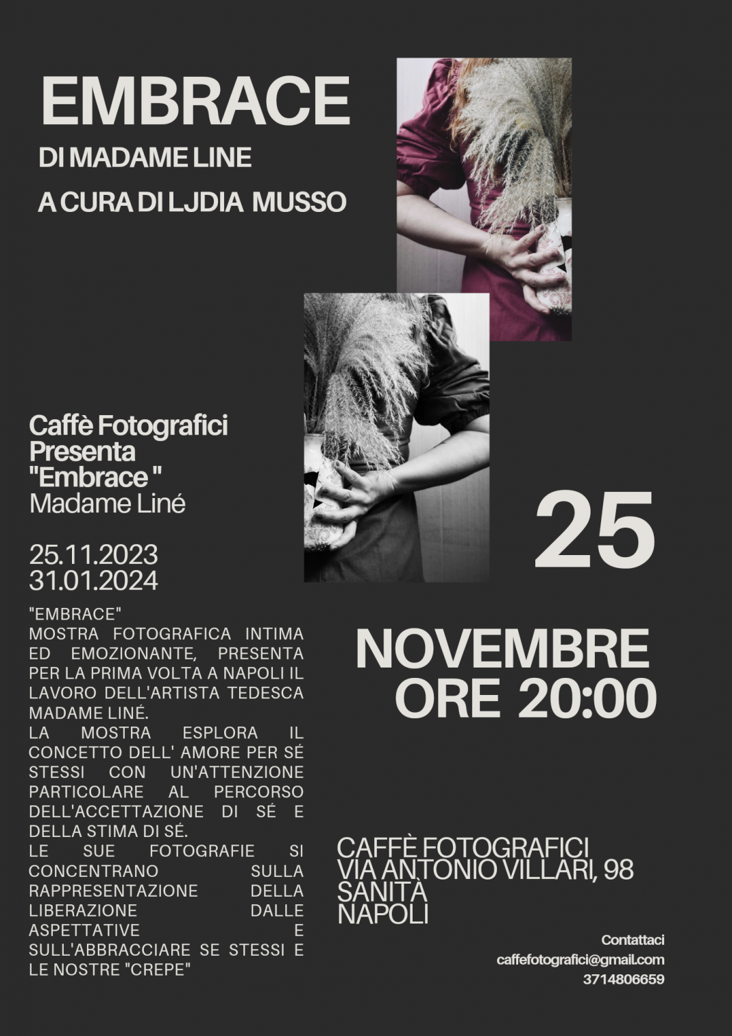 Inoltre, come parte del progetto "Self Love," "Madame Liné" presenterà contenuti di approfondimento online sulla pagina Instagram di Caffè Fotografici, offrendo ulteriori spunti di riflessione sul significato delle opere e del percorso dell'artista.