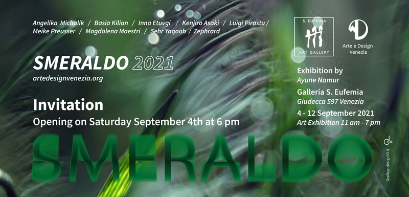 Dal 4 al 12 settembre si terrà la mostra d’arte “Smeraldo” alla galleria S. Eufemia, in Giudecca, imbarcadero palanca. L’inaugurazione si terra il 4 Settembre alle 18.La mostra sarà aperta tutti i giorni, orari dalle 11 alle 19, l’ingresso è gratuito.