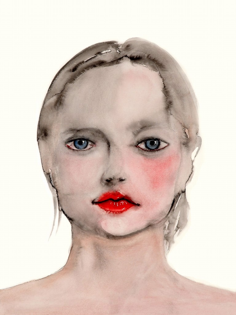 Maggior libertà compositiva si osserva nella decina di opere realizzate con la tecnica ad acquerello, dove la libertà gestuale ed espressionistica dell’acqua colorata disegna espressioni liquide e intense, oltre i contorni naturali del ritratto.
