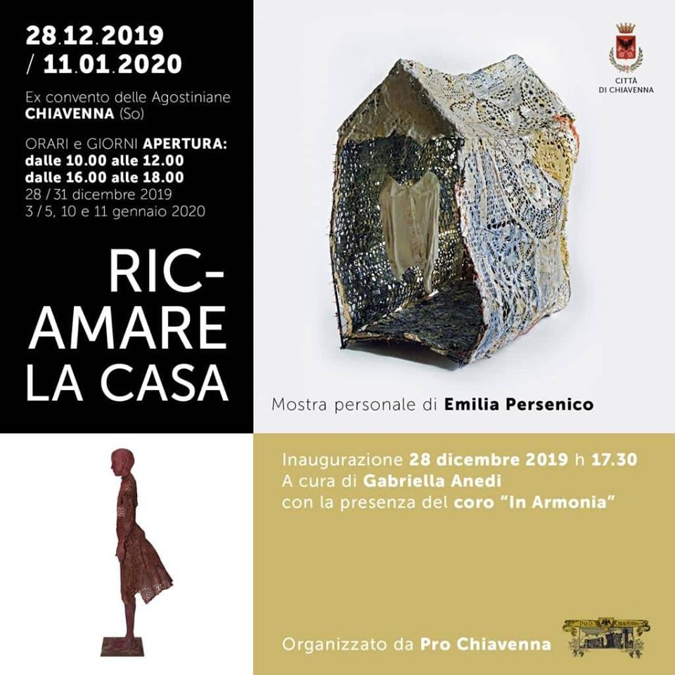 Nessuno spazio poteva risultare più adeguato di questo antico refettorio delle agostiniane nel monastero di Chiavenna. Le opere di Emilia Persenico si distribuiranno proprio nella grande stanza dove le monache consumavano i pasti sotto lo sguardo di una Sacra Famiglia riunita intorno al desco: un piccolo cenacolo famigliare che si pone come modello di relazione affettiva.