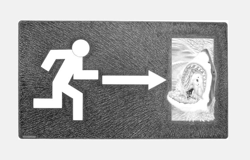 Ma attenzione, non si pensi che le “vie di fuga” possano salvarci dalle “trappole”. Eh, fosse così facile e lineare! Invece magari è proprio l’opposto. Mettiamo che sei un appassionato d’elettricità e ti riesce di districarti da una ben congegnata maliziosa ”trappola per elettrotecnici” (c’è in mostra...) ed eviti il trabocchetto, l’hai scampata bella e ti soffermi a respirare di sollievo per il passato pericolo... congratulazioni, sei stato vispo, ma ora: occhio! Sarai invitato a seguire la rassicurante freccia che dovrebbe portarti in salvo e di nuovo alla casina tua di pan pepato fra gli affetti e le coccole famigliari. E sarà peggio per te. Perché la via di fuga dal pericolo che imboccherai a tutta velocità ti porterà a fracassarti faccia e denti contro un solido muro di mattoni, rallenta la corsa, ma cadrai comunque nella vasca dove il pescecane ti sta aspettando perché sei la sua merenda, oppure procedi lentamente, così avrai tempo e modo di farti due canne o un paio di piste di coca che trovi sulla strada tanto c’è anche lo sgabello per riposare, peccato che sia sovrastato dal cappio scorsoio...