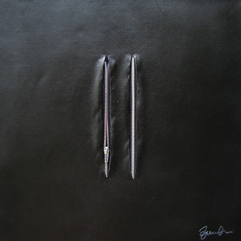 Quella di “Ricucio Fontana” non è altro che una sorta di divertente sfida, una provocazione nel segno del rispetto per un grande genio quale Lucio Fontana. Nell’approccio da artista col mondo dell’arte è inevitabile il confronto con i mostri sacri, la cosa importante è non soccombere rimanendo impietriti di fronte a tanto talento, e contribuire spesso sfruttando il loro stesso insegnamento. I tagli di Fontana sono passati alla storia, così come l’idea di Spazialismo, la sua ricerca di una quarta dimensione tangibile e innegabile. Nella mia operazione di chiusura dei tagli del Maestro non c’è un’idea di negazione ma di rinascita, di rielaborazione di un codice preesistente, di un nuovo punto di vista. L’approccio all’opera è sicuramente racchiuso nell’idea del Ready made Duchampiano, c’è l’aspetto dissacratorio, quello ludico e aggiungerei quello metamorfico, attraverso il quale un oggetto o un’opera d’arte diviene qualcosa d’altro e acquista così un nuovo significato. Nella serie “Ricucio Fontana” la cerniera assume contorni e significati diversi, innesca la curiosità e diviene mezzo di interazione tra l’opera e l’osservatore, che attraverso il gesto decide di porre fine all’attesa per giungere alla scoperta…