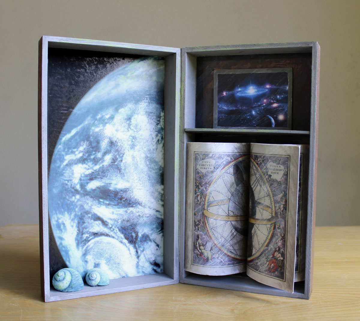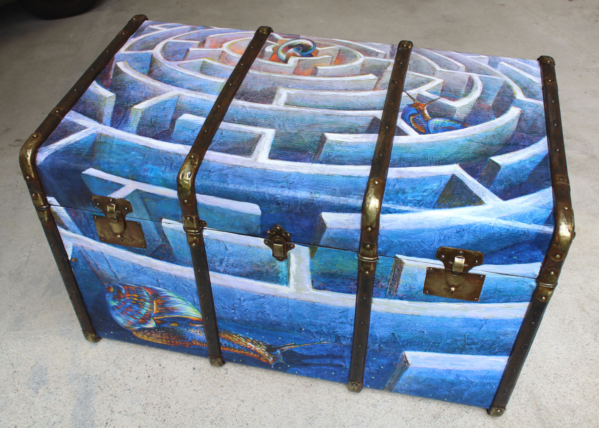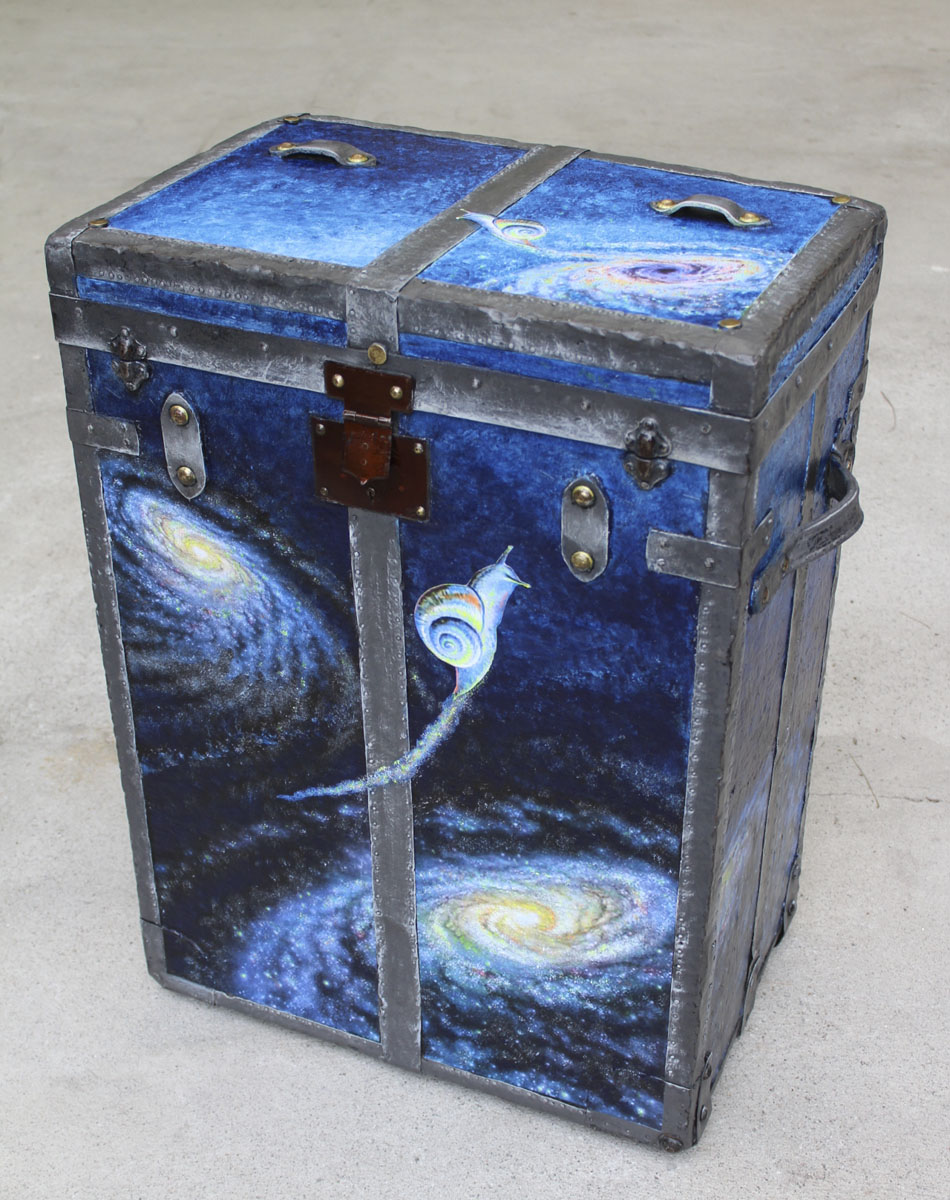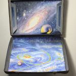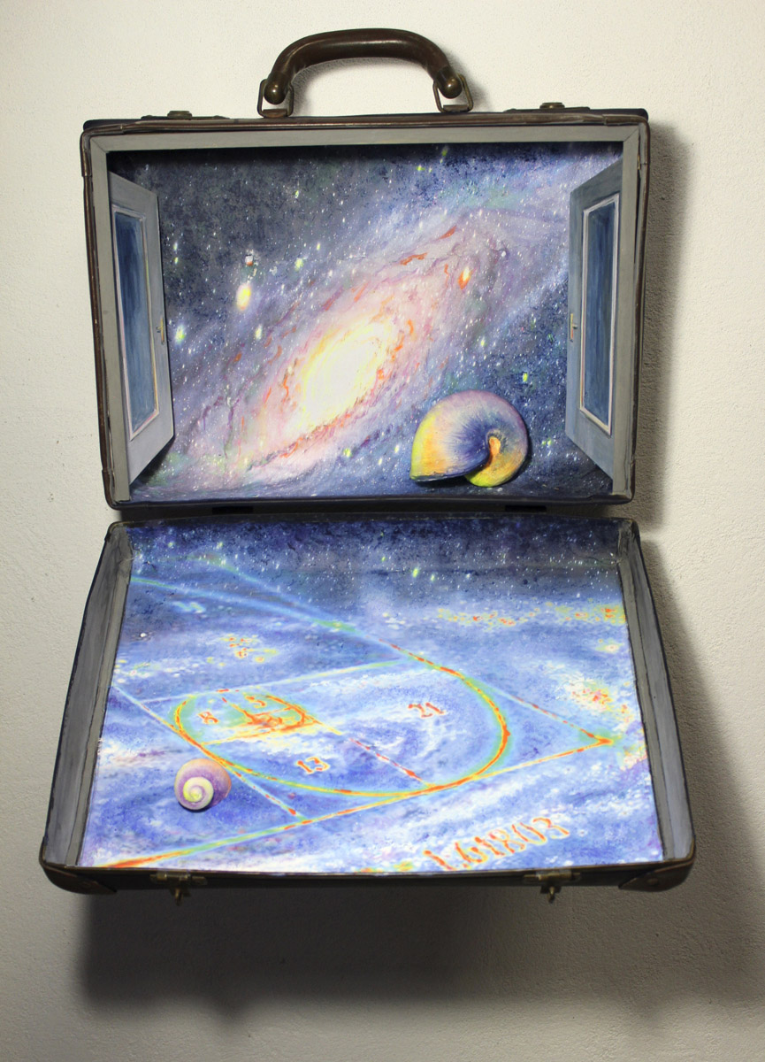 Bauli valigie scrigni. Il bagaglio come metafora di viaggi impossibili, di fughe verso l’infinito tra galassie vorticose, bagliori interstellari e buio cosmico. Strumenti da viaggio usati come supporto pittorico per narrazioni in un linguaggio estetico che intreccia tecnica digitale e pittura.