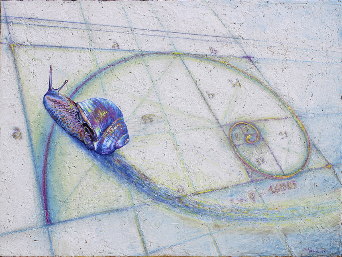Emilio Alberti presenta la sua Chiocciola Cosmica in una serie di dipinti e opere digitali. Una intensa narrazione per immagini intorno a un nuovo mito cosmogonico legato alla Sezione Aurea e alla serie numerica di Fibonacci. Un’autentica mitopoiesi.