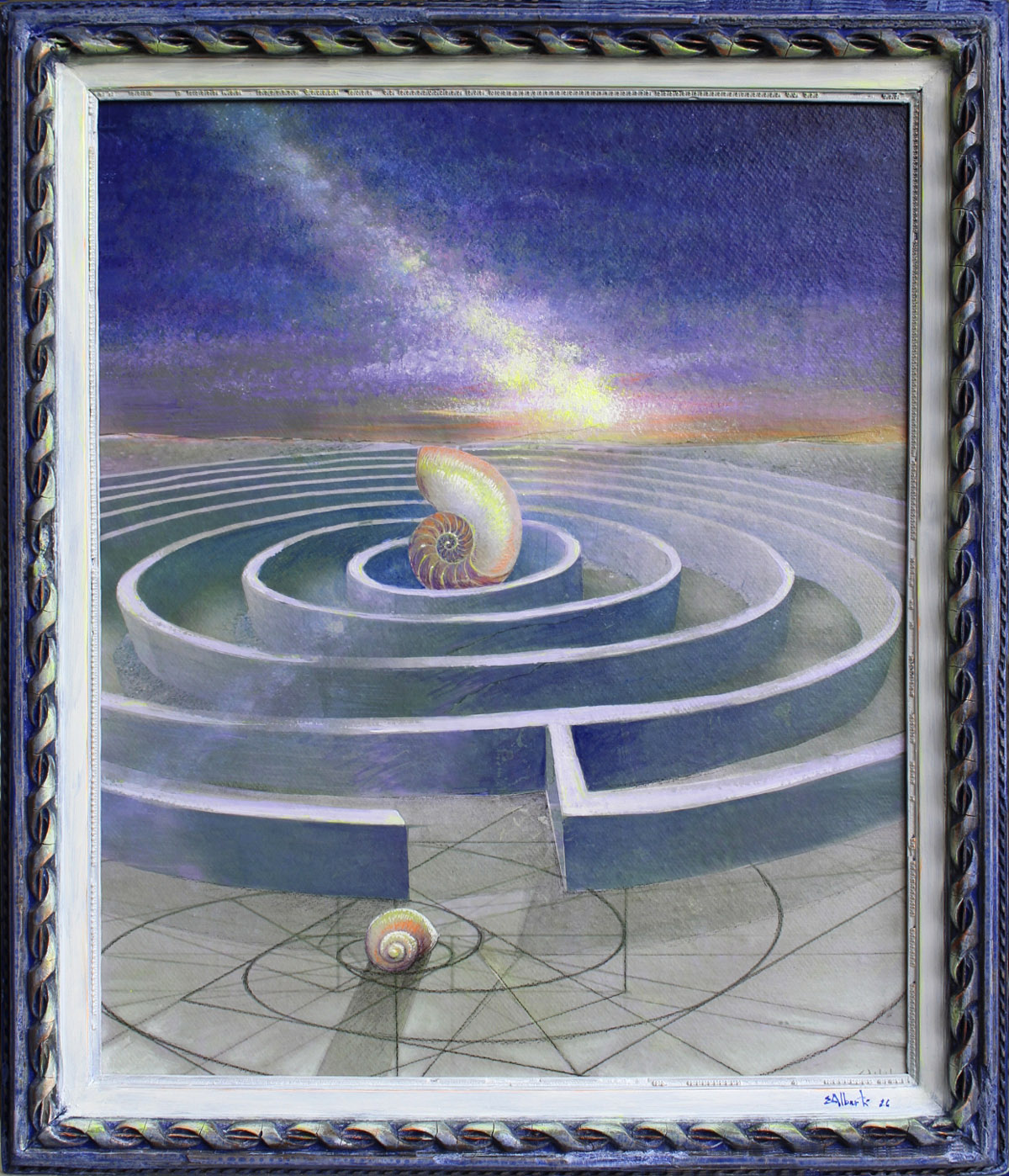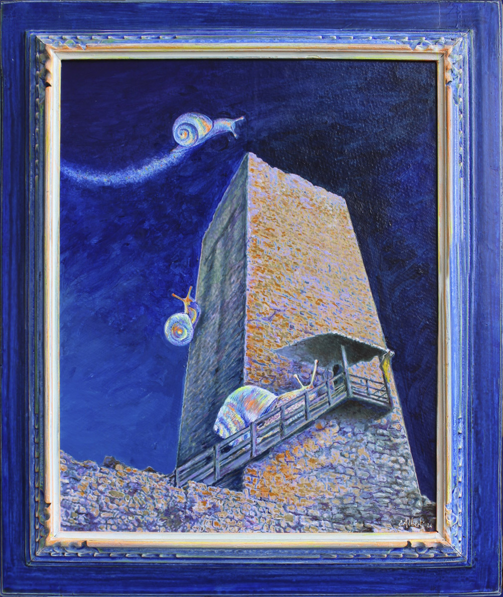 Ritorna il soggetto della finestra come concetto di soglia, come atmosfera e forma evocativa del passaggio fra un qui e un altrove; come occhio aperto su realtà visionarie, racconti notturni, sogni di cosmologie allucinate, galassie di mondi possibili dove protagonista è la Chiocciola Cosmica, una figura simbolica nata dalla fervida fantasia dell’artista, un singolare ed emblematico spirito guida. Alberti mette in scena una sorta di mitopoiesi di questo animale iconico il cui guscio spiraliforme esprime efficacemente la regola codificata nella Sezione Aurea. Diventa protagonista di una mitologia fantastica il cui racconto visivo ci porta altrove, in un’altra dimensione tra galassie trasfigurate dove si avverte un senso di sospensione e di attesa. Un complesso di segni tra i quali domina il vortice ad imprimere dinamismo alla composizione e a restituire il senso della temporalità nel tentativo di fissare l’istante originario: la prima scintilla, l’innesco della deflagrazione primordiale, il primo sussulto di quel moto perpetuo cosmico nel quale siamo immersi.