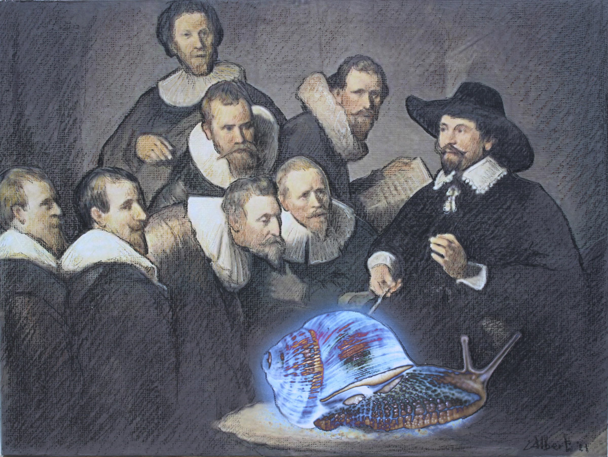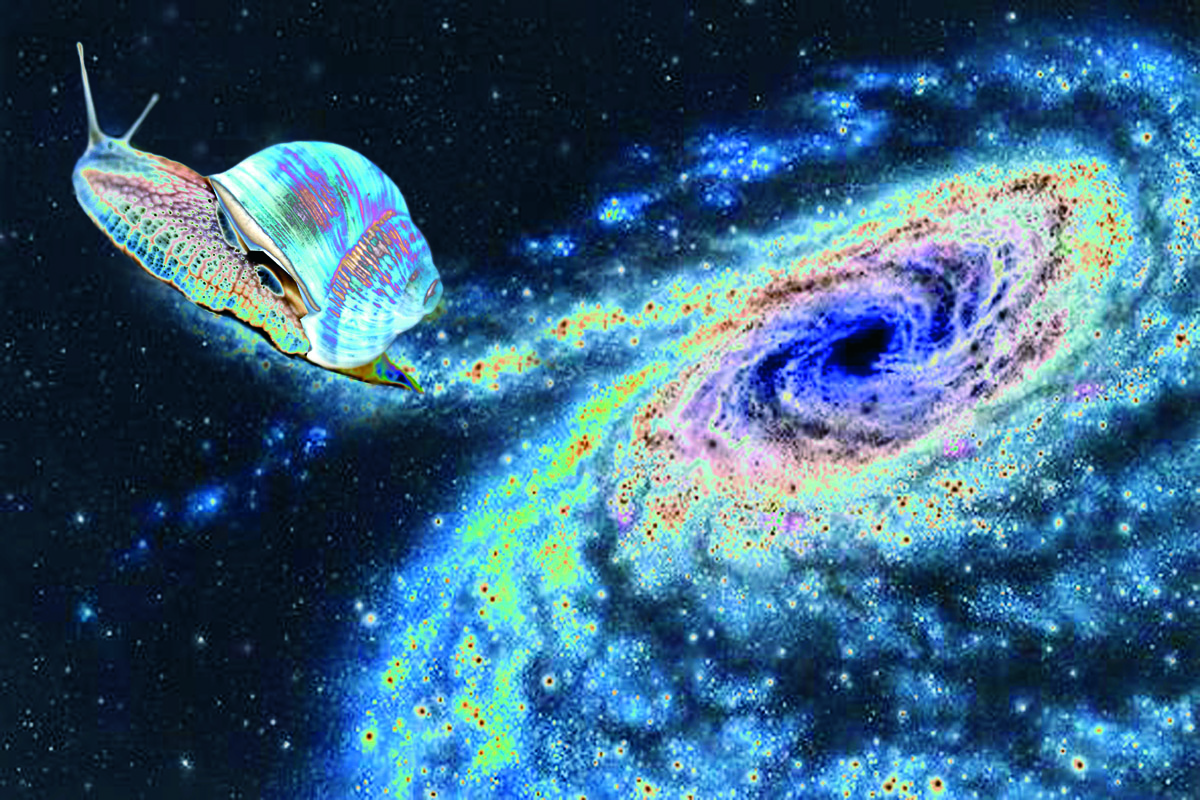 La mostra presenta una ventina di lavori tra stampe digitali, dipinti e collages. Riper-corre genesi e lo sviluppo della ricerca intorno al tema della Chiocciola cosmica, una nuova figura mitologica creatrice di mondi e di galassie, ricca di suggestioni metaforiche legate alla Sezione Aurea e alla