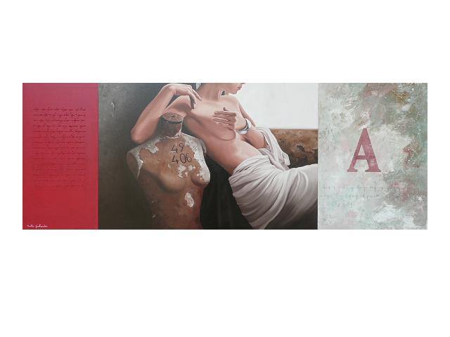 Vi è in entrambi un calcolato gioco di equilibrio e disequilibrio tra sintesi delle linee e ricchezza dei dettagli, ma mentre Emilio Gualandris perviene ad una sublimazione della realtà per una via più ardita, e cioè accostando a figure di donna in pose e abiti quotidiani, dipinte con maniacalità iperrealista, lettere enigmatiche e chiazze di colore informale, Paolo Rossetto invece si muove su di una linea più sottile, sullo scarto, sullo slittamento tra un disegno a matita sfumato e delicato che delinea la corposa rotondità di volti ed elementi vegetali (rami, frutti) e una stesura su più o meno ampie porzioni di tela di un colore ‘a plat’. Le donne di Gualandris sono ragazze metropolitane dall’abbigliamento e dalle pose disinvolte, ‘glam’: insomma, la classica modella della porta accanto. Quelle di Rossetto figure di un mito declinato nei tratti di una affascinate semplicità.