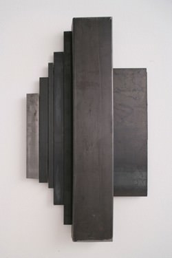 In mostra due grandi sculture e alcuni dei suoi Dipinti/Scultura: delle forme geometriche realizzate unendo pezzi di misure e, spesso, di materiali diversi che vengono poi appese alla parete come fossero dei quadri.