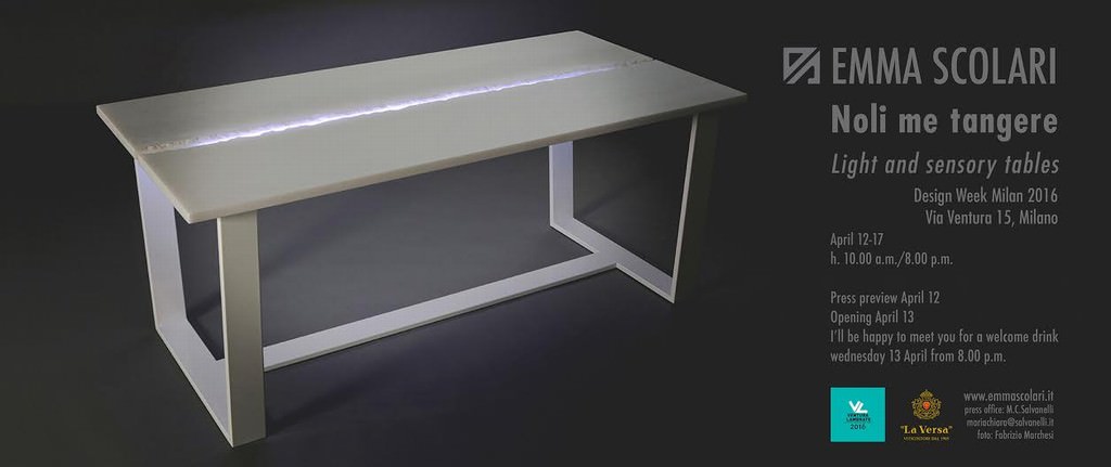 Noli Me Tangere è un’installazione luminosa che prende il nome da una sere di tavoli lampada progettati dalla designer Emma Scolari e composti da una lastra di marmo “spaccata” a metà che crea al centro una crepa che si illumina con un semplice sfioramento delle dita. L’installazione è un wooden box al cui interno sono posizionati tre tavoli lampada, realizzati con tre diversi tipi di marmo dai colori puri – bianco cristallino, nero assoluto e rosso travertino persiano. Una sottile fessura a soffitto lascia affiorare nell’ambiente una lama di luce che richiama per simbiosi la crepa luminosa dei tre tavoli, mentre sulla parete di fondo una videoproiezione di un silenzioso cielo notturno improvvisamente illuminato, squarciato, crepato da un lampo e dal suo tuono.