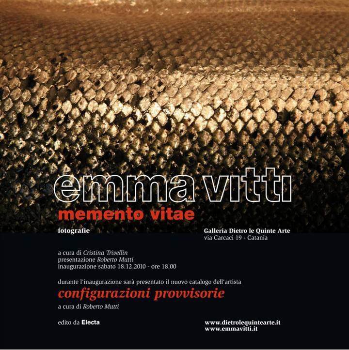 Emma Vitti ama dire che tutti noi facciamo fatica a sopportare la morte perché la nostra cultura ci impedisce o ci rende difficilmente raggiungibile la dimensione del piacere e che quindi, di questo, e non della morte, abbiamo davvero paura. È una tesi interessante per comprendere le sue ricerche fotografiche dove la sensualità , che è sempre ben presente, si insinua fra le pieghe della realtà per riapparire in tutta la sua insidiosa attrazione seduttiva.