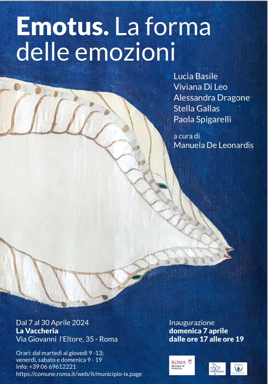 Il Municipio IX Eur del Comune di Roma in collaborazione con l’Associazione di Promozione Sociale Ara Macao e il patrocinio dell’Associazione SIPEA onlus (Società Italiana Psicologia, Educazione e Artiterapie) presenta la mostra Emotus. La forma delle emozioni – opere di Lucia Basile, Viviana Di Leo, Alessandra Dragone, Stella Gallas, Paola Spigarelli, a cura di Manuela De Leonardis, nello spazio espositivo La Vaccheria, nuovo polo museale di Roma Capitale.