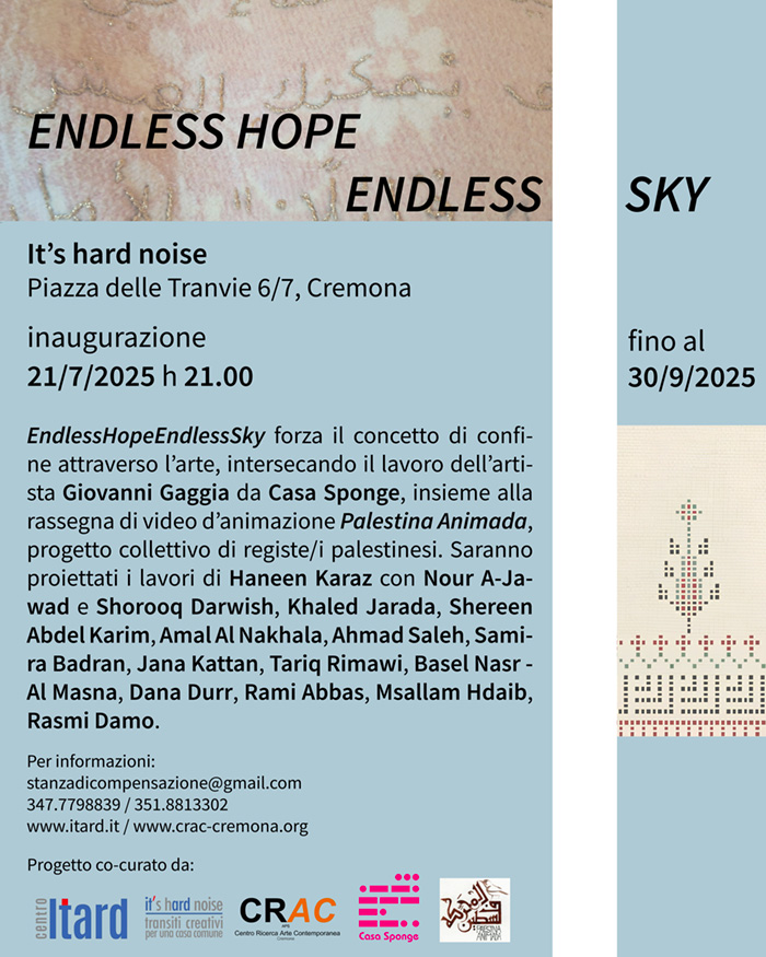 Lunedì 21 luglio alle ore 21.00, lo spazio di It’s hard noise di Cremona, in Piazza delle Tranvie 6/7, inaugura EndlessHopeEndlessSky, esposizione che accoglie due interventi paralleli e allo stesso tempo interrelati da precisi intenti, tematiche e urgenze. Un raccordo di più voci accomunate dal desiderio di intessere attraverso l’arte una rete di resistenza concreta per la Palestina oltre confini fisici e geografici.