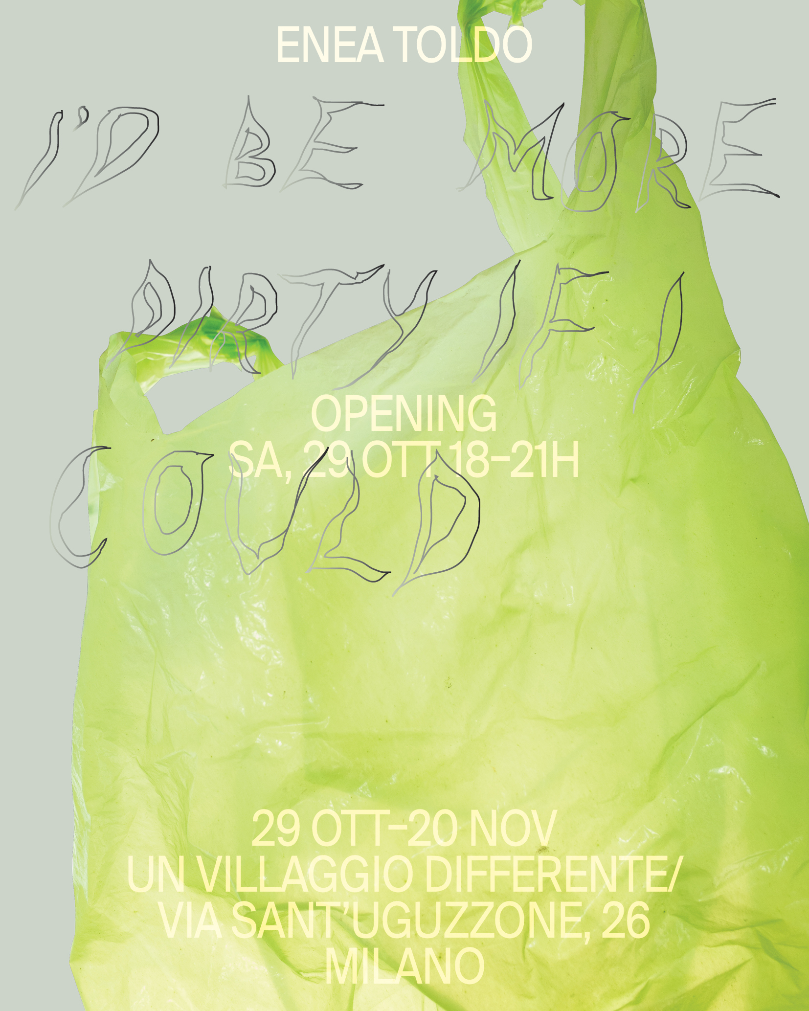 I’d be more dirty if I could è la prima mostra personale in Italia di Enea Toldo, artista svizzero da qualche anno di base a Milano. La pratica di Enea Toldo si pone all’interno di un engagement culturale che riflette su quelle istanze collettive oggi estremamente urgenti e attuali, come la questione ambientalista e ecologica.