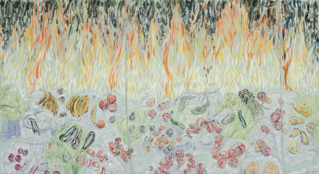 La mostra si compone di un ristretto numero di dipinti, cinque ritratti e una grande natura morta che si estende orizzontalmente come se fosse un paesaggio. I dipinti sono realizzati con colori liquescenti su tele ricoperte da un intonaco di terra cruda con argilla, sabbia e paglia.