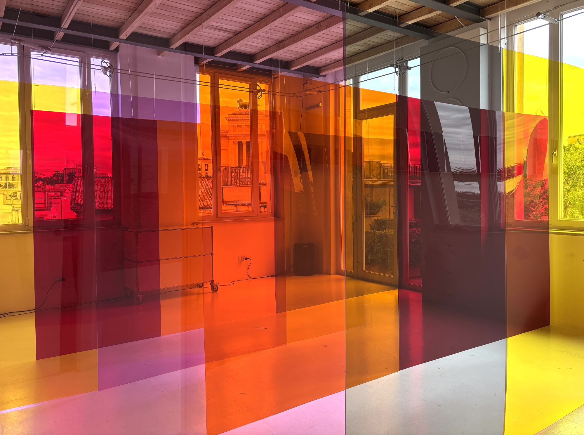 Il “cerchio magico” del 2000, dunque, cresce e si sviluppa, trasformandosi da “striscia” cromatica e cangiante, in una vera e propria onda di energia universale. EPVS, in linea con la sua ricerca, da prova della massima libertà e, pur riconoscendo con gratitudine il passato, di cui offre una testimonianza concreta in un frammento di circa 4 metri sulla parete dell’atelier, rompe il cerchio per creare un vero e proprio cammino, in cui i dipinti in acrilico su tela, dalle contenute dimensioni, cedono il passo a grandi lastre di plexiglass colorate, che le consentono di introdurre altri due essenziali elementi. Da una parte la luce, diretta conseguenza della trasparenza del materiale adoperato; dall’altra il suono che deriva dalla sua preziosa collaborazione, ormai in auge dal 2019, con il sound designer Sebastian Vimercati; suo figlio, che 25 anni fa era una possibilità di vita in attesa di nascere.