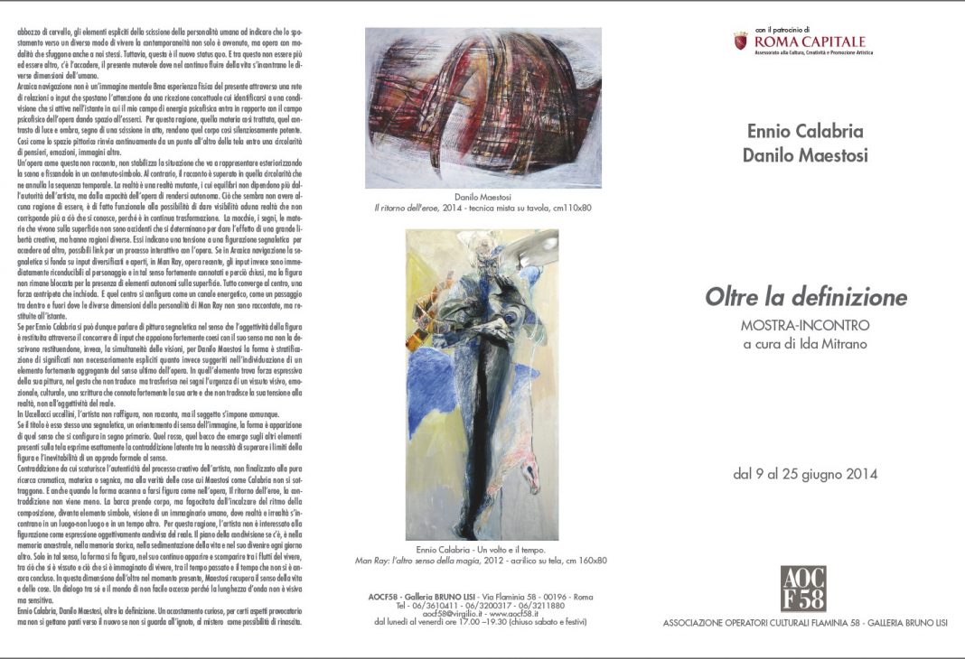 Nell’ambito delle iniziative promosse dall’Associazione AOCF58, la mostra dal titolo Oltre la definizione, progettata e curata da Ida Mitrano, intende proporsi più che come evento espositivo come mostra-incontro sulle problematiche di fondo che oggi non possono più essere ignorate ma che, anzi, richiedono un necessario confronto sullo stato dell’arte contemporanea. In tal senso, l’evento espositivo si caratterizza in primo luogo come dibattito attraverso il dialogo tra due artisti, Ennio Calabria e Danilo Maestosi, e le loro diverse ricerche. Un dialogo tra differenti modus operandi e differenti approdi di cui le opere sono espressione diretta e autentica.