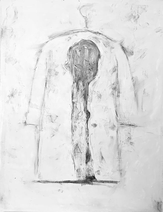 ‘Ma io … abito qui?’, mette in crisi già, nel titolo, la distinzione fra oggetto e soggetto. In ripetizione installativa, il soggetto rappresentato è uguale a se stesso, ma i monocromi differenziati per presenze ripetute, accendono sentimenti potenti e unici, nella solitudine di una memoria di dolore. La stesura pittorica indugia paziente e stratificata come il tempo, quando remota è la memoria. La forma provoca l’organizzazione mentale dello spazio e dalle giacche “sventrate” si aprono serrature del corpo per presenze oltre la materia.
