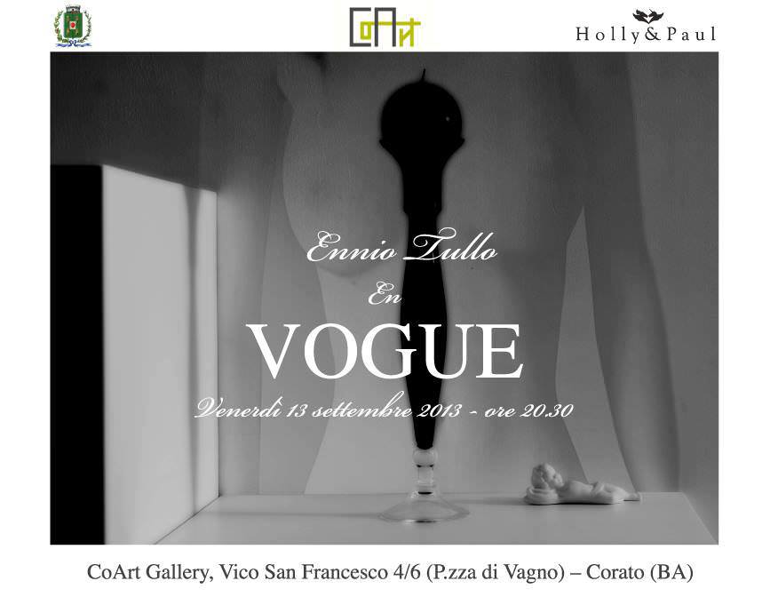 Il titolo dell'esposizione, Ennio Tullo En Vogue, preannuncia l'intento artistico di seguire le tracce della carriera dell'artista coratino nelle sue espressioni visive riconosciute e apprezzate dai photo editor della nota rivista Vogue. L'inaugurazione, prevista alle ore 20.30, vedrà il centro storico animarsi di immagini che si scagliano cromaticamente sul paesaggio murgese, quale backstage favorito da Tullo per i suoi scatti fotografici che sembrano sondare le innumerevoli armonie emotive di sguardi, oggetti e paesaggi.