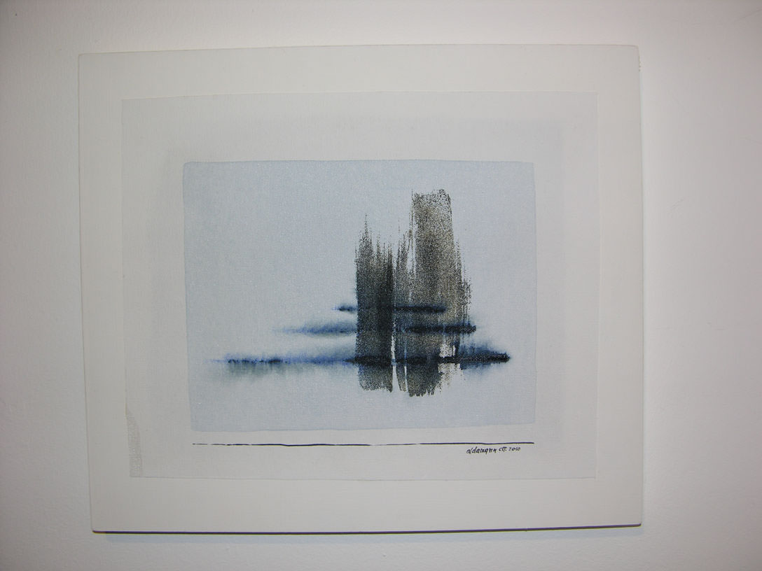Il supporto pittorico è fondamentale per Aldamaria: è una struttura che le consente di provare un’emozione per poter creare, e la linea che troviamo in fondo a tutti i suoi lavori sorge da un rispetto per la tela che sottintende il timore di corromperla e che porta l’artista a chiederle il permesso di andare avanti. La linea le procura così la sicurezza di cominciare le sue opere e le infonde il coraggio per proseguire, è la “piuma di Dumbo” del suo “cerchio magico”, delle sue Poesie senza titolo in rime trasparenti”.
