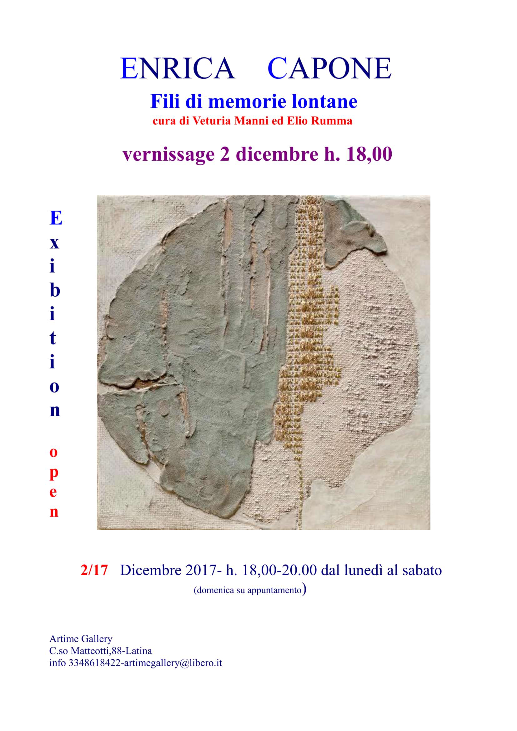 Il percorso artistico di Enrica Capone si è sempre snodato attraverso una costante ricerca di linguaggi espressivi che, partendo da una solida base figurativa, si sono evoluti nel tempo in un' astrazione fatta di rimandi ad un mondo fantastico di concezione quasi neo-platonica. Anche i materiali delle sue opere si sono via via arricchiti di insoliti connubi tra mezzi pittorici tradizionali e sostanze usualmente adoperate per altri scopi (piombo fuso,lamine metalliche, ecc.). Nelle opere più recenti di Enrica si può intravvedere una sorta di ritorno alle origini ma con una maturità concettuale assolutamente innovativa. Questa mostra intende essere un breve riepilogo di un lavoro