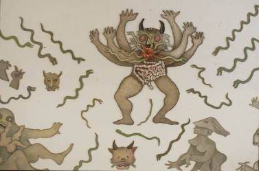 Tragica e grottesca, ironica e preoccupata, l’Apocalisse di Enrico Baj mette in scena, quasi teatralmente, il degrado della contemporaneità, le macchie nere e gli incubi generati dal sonno della ragione, le attese e le premonizioni, l’esuberanza del mostruoso.