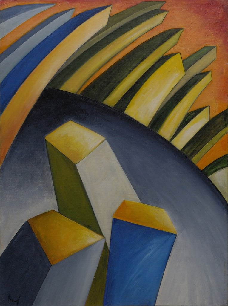 “[…]Sono paesaggi di natura cubo-futurista, strutturalista, costruttivista piuttosto, irti come appaiono di costruzioni: cubi e parallelepipedi si slanciano verso l’alto spesso ad aprire una specie di arco immaginario, come in una fotografia fatta con un supergrandangolo, meglio con il fish-eye. È uno spazio curvo, ampio, che tende alla vertigine dell’infinito: non è lo spazio dell’attuale metropoli, ma quello della megalopoli futura.[…]” Enrico Baj.