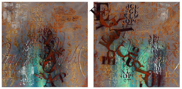 In mostra pitture, sculture e installazioni di grandi dimensioni, in un allestimento site specific dove si trovano aumentati di scala, nell’inconfondibile linguaggio dell’artista, elementi che siamo abituati a vedere in piccole dimensioni, a cominciare dalle lettere dell’alfabeto in carattere di stampa Bodoni. Ritagliate da lastre sottili di cor-ten o di acciaio mirror, esse impongono la loro presenza sia a livello materico che attraverso il loro sovradimensionamento. Si inerpicano, intessono e ordiscono. Diventano storie da leggere in modi sempre nuovi, la cui interpretazione è libera e soggettiva, e affermano la forte personalità dell’autore e il suo irrefrenabile desiderio di comunicare.