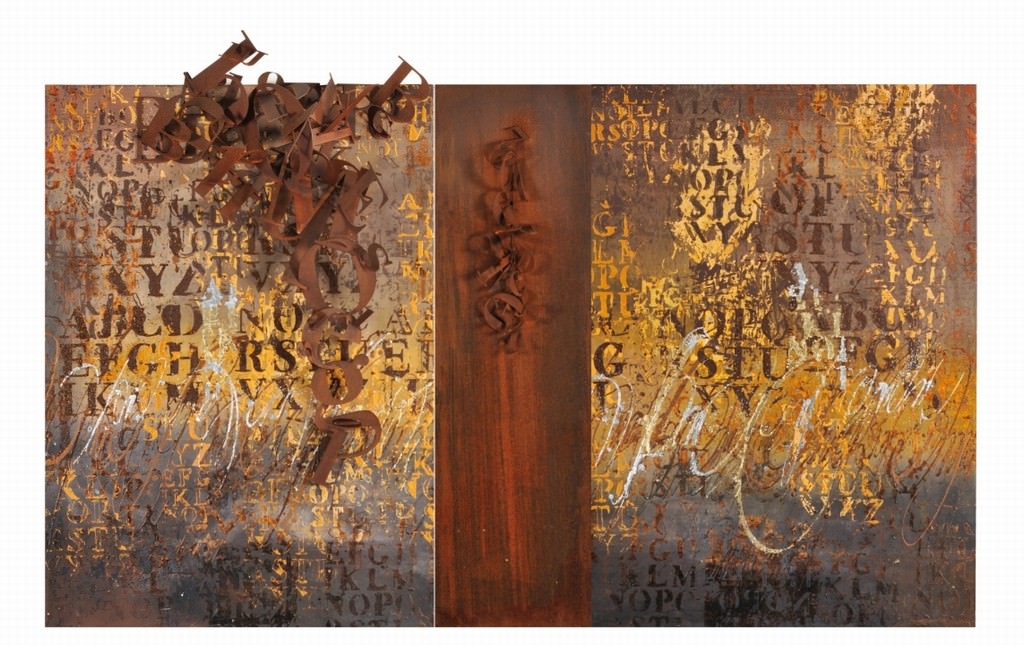 Le lettere infatti cadono dalle pagine creando nuove avventure che l’immaginazione dello spettatore assorbe e rielabora, attribuendo ad esse ogni volta un diverso significato. L’acciaio corten, materiale naturale usato per le sculture, trasmette alle opere quella patina di passato che evoca in pieno il fascino dei grandi volumi di storie.