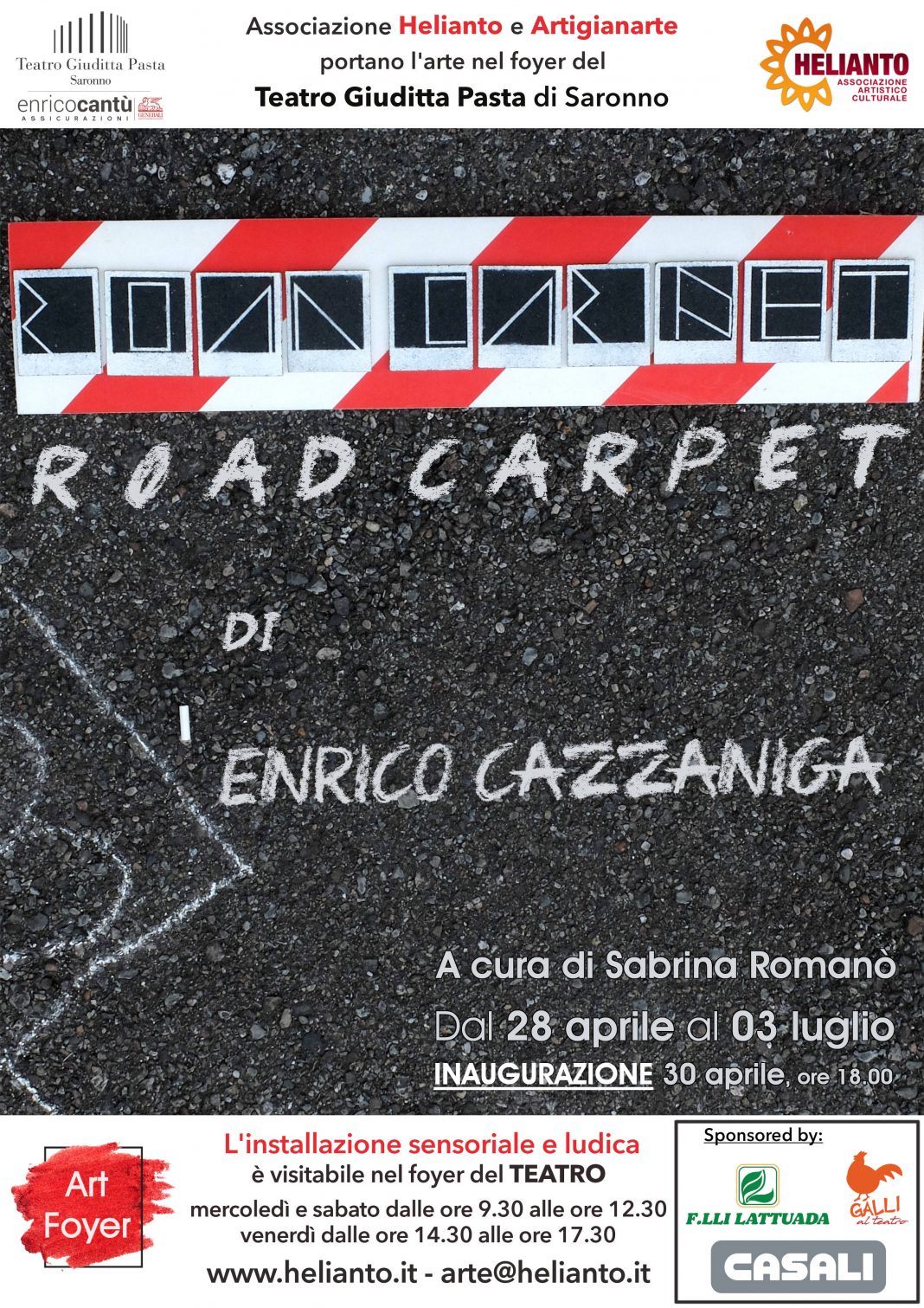 “Road Carpet” è a cura di Sabrina Romanò. Le installazioni saranno visitabili nel foyer del teatro dal 28 aprile al 3 luglio 2022 in occasione degli spettacoli in cartellone e negli orari di apertura della biglietteria: mercoledì e sabato dalle ore 9.30 alle ore 12.30; venerdì dalle ore 14.30 alle ore 17.30.