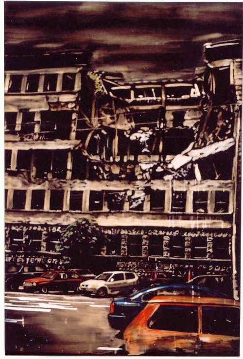 In un quadro c'è un palazzo militare distrutto esternamente e sventrato internamente. Ma è lì e lì rimane, mentre la vita va avanti e scorre, come le automobili che passano e si sorpassano; un’auto nuova blu, europea, e un’altra, vecchia e arancione, tipica di quei paesi. Sul fondo altre sono parcheggiate; anche lì sono vicine, vecchie e nuove, rosse come il sangue versato, bianche come l’innocenza. E convivono nello stesso luogo e città. C’è un albero verde e rigoglioso ai piedi della rovina.