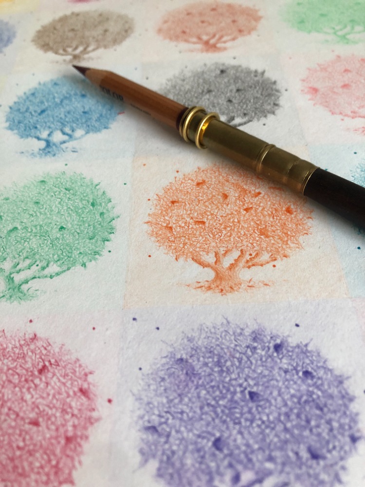 La pazienza prende forma in cinquantasei opere grafiche, eteree e raffinate, realizzate con matite colorate, cinquantasei alberi di cui cinquantaquattro uguali, la cui unica variante è determinata dalla sfumatura cromatica. Alberi dalle chiome traboccanti di fogliame, che ci ricordano l’origine del mondo, la bellezza della lentezza, del donare e donarsi all’altro.