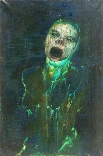 Essa non può che concretizzarsi nelle fattezze di una giovinezza, o addirittura di una infanzia che aspira all’eternità, cui è però negata dal fato ogni felicità, allora e poi, nell’età adulta. L’”horror vacui” che la circonda, non può che travolgerla, esageratamente, fino a comprimere e subissare, nell’ossessivo istinto della ‘coazione a ripetere’ - testimoniata visivamente dall’aggressività del modulo decorativo - ogni pretesa di vita che ambisca a dignità, almeno corporea, energetica, vitalistica. Proprio come il volto già inceronato di un attore che si affaccia, prima dello spettacolo, a studiare il pubblico in sala, per curiosità, per ansia o per caso - solo per un attimo - tra le pesanti ed opprimenti coltri panneggiate di un gigantesco sipario, ancora ‘tirato’.