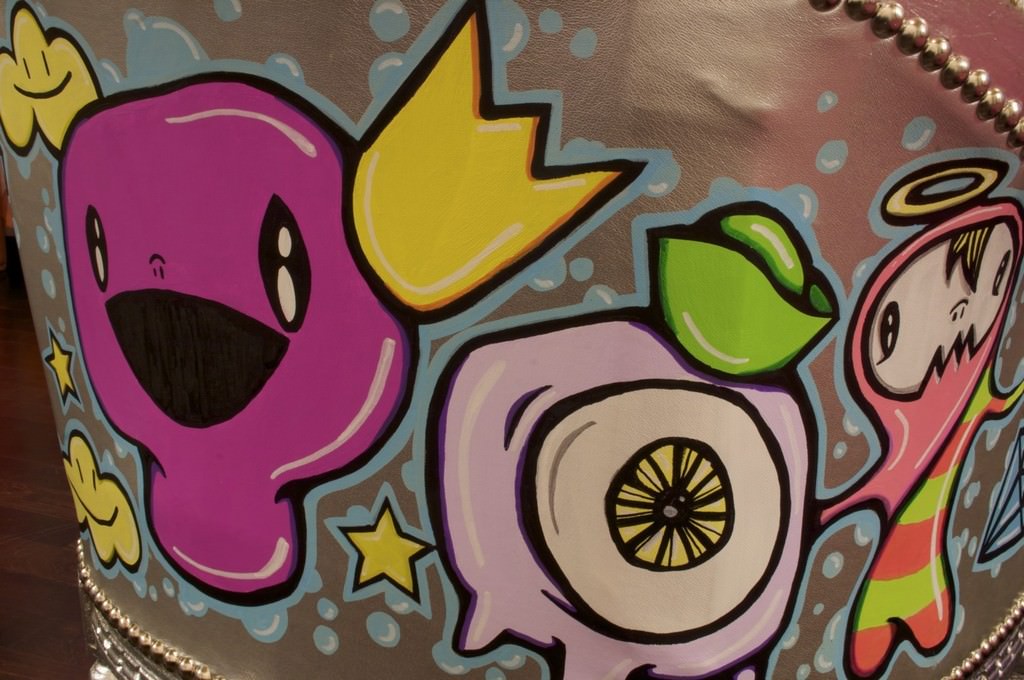 Sono circa 30 soggetti, dipinti con colori ad acrilico, bombolette spray, smalti e makers, distesi sulle superfici più disparate, tra cui anche una poltrona nel ruolo di “trono”, una sedia in stile Barocco decorata con personaggi fantastici, mostri e fantasmi incoronati al posto dei consueti principi: il surrealismo del ventunesimo secolo incontra il passato.