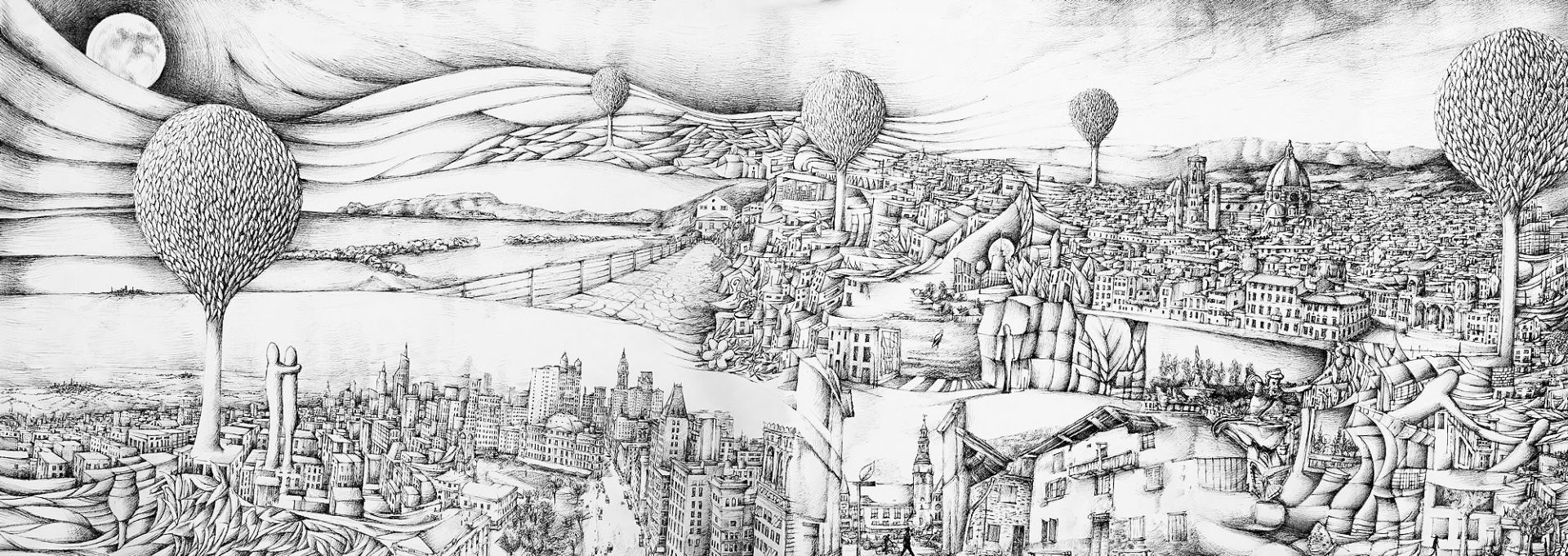 In alcune opere tale processo risulta di matrice mondriana, dove una nuova geometria ricrea una visione razionale delle architettura, che perde la sua profondità, si frammenta diventando dinamica attraverso linee e colori brillanti contornati da un profilo nero. Grandi alberi primeggiano creando un ritmo in successione che si ripetono nello spazio, paesaggio e architettura s’ intersecano in una giostra di forme in evoluzione con una visione che travolge il fruitore in un contesto surreale e fiabesco.