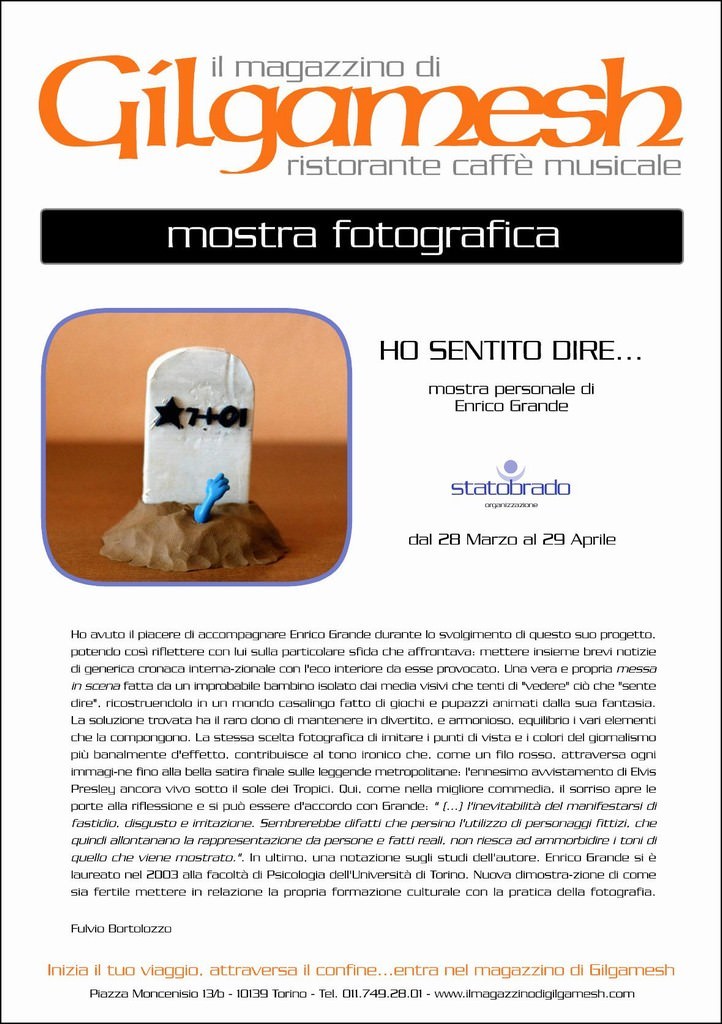 Ho avuto il piacere di accompagnare Enrico Grande durante lo svolgimento di questo suo progetto, potendo così riflettere con lui sulla particolare sfida che affrontava: mettere insieme brevi notizie di generica cronaca interna-zionale con l'eco interiore da esse provocato. Una vera e propria messa in scena fatta da un improbabile bambino isolato dai media visivi che tenti di "vedere" ciò che "sente dire", ricostruendolo in un mondo casalingo fatto di giochi e pupazzi animati dalla sua fantasia. La soluzione trovata ha il raro dono di mantenere in divertito, e armonioso, equilibrio i vari elementi che la compongono. La stessa scelta fotografica di imitare i punti di vista e i colori del giornalismo più banalmente d'effetto, contribuisce al tono ironico che, come un filo rosso, attraversa ogni immagine fino alla bella satira finale sulle leggende metropolitane: l'ennesimo avvistamento di Elvis Presley ancora vivo sotto il sole dei Tropici. Qui, come nella migliore commedia, il sorriso apre le porte alla riflessione e si può essere d'accordo con Grande: " (…) l'inevitabilità del manifestarsi di fastidio, disgusto e irritazione. Sembrerebbe difatti che persino l’utilizzo di personaggi fittizi, che quindi allontanano la rappresentazione da persone e fatti reali, non riesca ad ammorbidire i toni di quello che viene mostrato". In ultimo, una notazione sugli studi dell'autore. Enrico Grande si è laureato nel 2003 alla facoltà di Psicologia dell’Università di Torino. Nuova dimostrazione di come sia fertile mettere in relazione la propria formazione culturale con la pratica della fotografia.