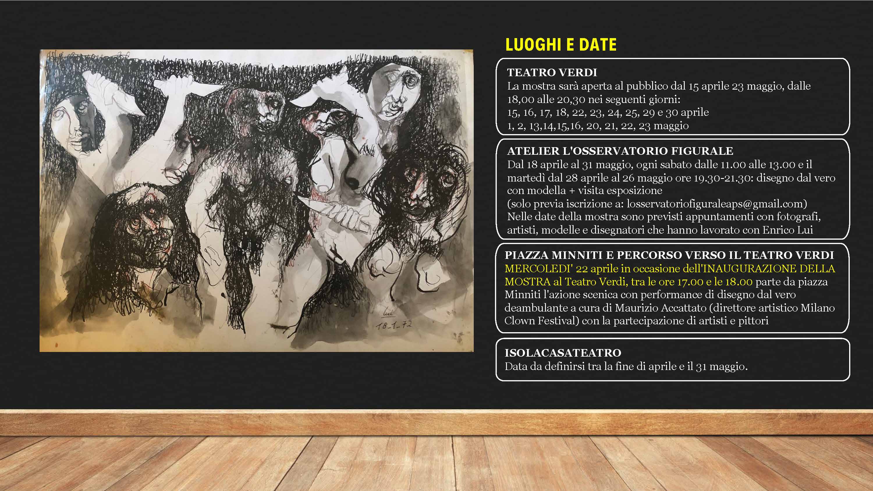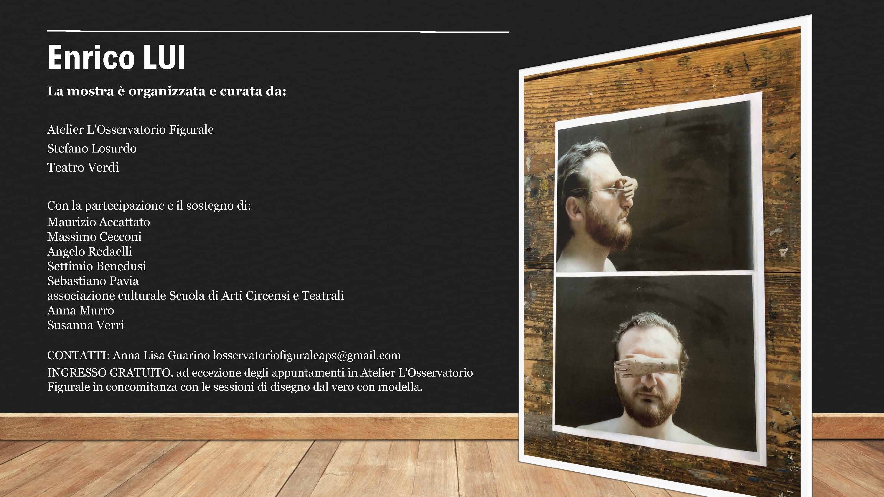 TEATRO VERDI: Dal 15 aprile 23 maggio, dalle 18,00 alle 20,30 nei seguenti giorni: 15, 16, 17, 18, 22, 23, 24, 25, 29 e 30 aprile. 1, 2, 13,14,15,16, 20, 21, 22, 23 maggio. ATELIER L'OSSERVATORIO FIGURALE: Dal 18 aprile al 31 maggio, ogni sabato dalle 11.00 alle 13.00 e il martedì dal 28 aprile al 26 maggio ore 19.30-21.30: disegno dal vero con modella + visita esposizione (solo previa iscrizione a: losservatoriofiguraleaps@gmail.com). Nelle date della mostra sono previsti appuntamenti con fotografi, artisti, modelle e disegnatori che hanno lavorato con Enrico Lui. SABATO 16 maggio h. 18.00 ANGELO REDAELLI fotografo: "l'arte e lo sguardo condiviso con Enrico Lui".