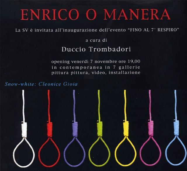 “Fino al 7° respiro” e’ il titolo dell’installazione di ENRICO MANERA che dal 7 novembre, sara’ visibile in ben sette gallerie italiane. Già da qualche tempo collezionisti, critici, galleristi e non addetti ai lavori, avevano ricevuto “quel curioso preinvito” anonimo di colore nero, da un lato appariva in inglese la scritta “ PREPARE YOUR SELF”(preparati), dall’altro un disegno di un cappio , sul cui fondo campeggiava in trasparenza un numero “7”…messaggio non certo rassicurante.